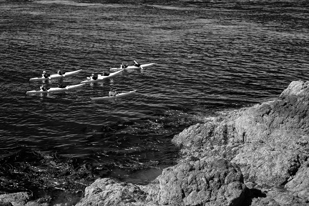 I am amazed, when we reach the parking lot, to find it virtually empty. A couple of cars, but no trouble parking. Two months earlier, out on the remote Washington coast, the parking lots were stuffed with cars, and natives were selling spots within walking distance of the beach. Where are all of the people? We walk through a grove of Madrone trees, twisted into surrealistic shapes by the pressure of the relentless wind, and reach a bluff overlooking the water. Placards describe the habits of the Orca, but, sadly, there are no whales cavorting among the waves. The only obvious critters are a flotilla of sea kayakers oaring past.