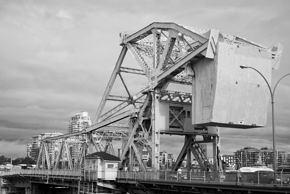 In the evening, two tug boats straddle an empty sand barge, like collies shepherding a recalcitrant pig, and nudge it out into the middle of the Upper Harbour. Crew boats detour around the load, and even the pickle boats, with their superior maneuverability, keep an eye on it. As the tugboats light up their diesels and begin to shove the ungainly load slowly seaward, a siren sounds on the Johnson Street Bridge, undulating loudly. Pedestrians and bicyclists make a hurried dash across the span. Traffic barriers drop at each end, and then the large concrete counterweight is released, slowly dragging the bridge deck into the sky. The steel span groans higher, rising until, pointed nearly straight up, it creaks to a stop. The tugs dig into the saltwater, maneuvering their barge toward the open slot.