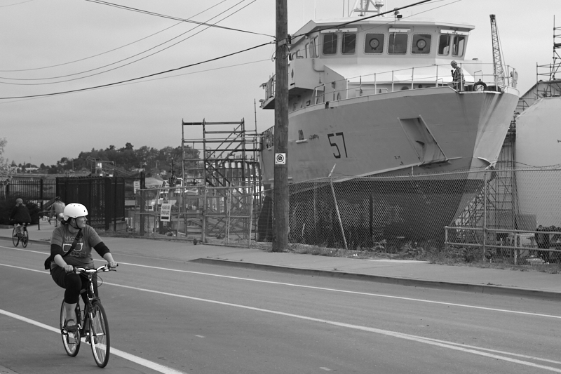 Amid the flow of the bicycle rush hour, we cross the Johnson Street Bridge and turn north. The Galloping Goose Trail parallels the shores of the Upper Harbour, taking us past shipyards and waterfront homes.