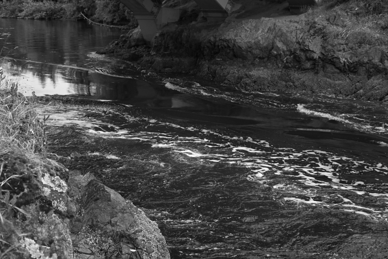 Our destination, the northern end of our loop, was Esquimalt Gorge Park, which surrounds an inlet known as Gorge Waters. It was a lovely — and on a Friday morning — empty park. A pleasant walkway parallels the water. At the southern end of the park are the famous "Reversing Falls," a short course of rapids over which the tidal waters flow. When the tide is flooding, the water runs north, over the falls. When it ebbs, the falls run south. A neat party trick.