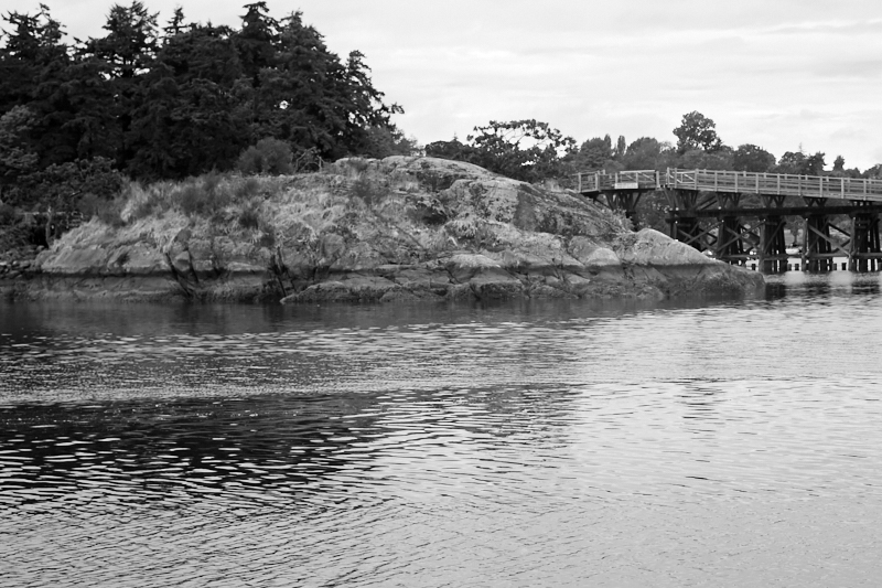 We cross the Gorge at this point, and head back along city streets. Eventually we rejoin the Galloping Goose Trail and close the loop. The trail passes over the water at the Selkirk Trestle Bridge. To the left, alone in the center of the water, stands Halkett Island, a sacred site for First Nations people. This small stump of a rock was a cemetery island for the Songhees tribe. Over the centuries, a certain number of subsurface graves were carved out of the rock, but most bodies were placed in wooden burial boxes aboveground. The cemetery island had been the last resting place of tribal leaders since long before the arrival of the Europeans. This came to an end in 1867, when four young British lads swam out to the island and set it on fire. Their prank destroyed the cemetery, turning the wooden monuments into smoke and ash.