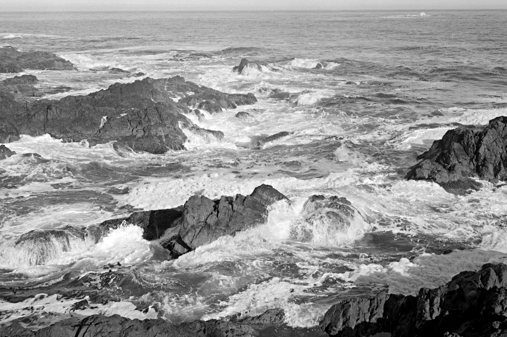 Its shape was dictated by the hostility of its environment. Although the sea is relatively calm when we visit, hurricane force winds often push waves right over the structure. The first attempt at a navigational aid was an open wood tower, built on the spot in 1906. This lasted eight years, before a wave swept the tower away. The present monstrosity, built of concrete and stone, was finished in 1915. It is a dangerous spot: a placard shows a three photo sequence of tourists standing out on the rocks beside the lighthouse (ignoring the danger signs): first, happy people waving at a camera, next a wall of white water rising behind them, and in the final image, they are engulfed. Their ultimate fate is a mystery: were they swept out to sea, or simply soaked? In any event, even on a calm day, rogue waves crossing the Pacific make the rocks around the lighthouse extremely perilous.