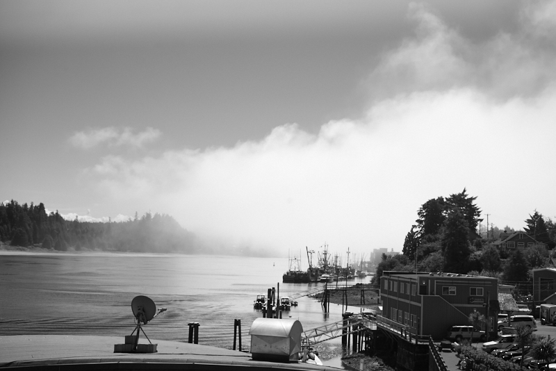 Our trail comes to an end just beyond the grove, leaving us a couple of miles to hike back into town. As we've been walking, I've kept a weather eye on a bank of fog sitting about five miles out to sea. Too many years living on the coast in Grays Harbor convince me that our sunny day is at risk. Sure enough, shortly after we return to our aerie, fog begins sliding up the channel, obscuring, first, the trees at the far end, and, next, the fishing boats in the middle distance. This is typical weather along the Pacific Coast — it becomes so bad in the later summer that the locals of Ucluelet have renamed the most notorious month "Fogust." When the sun heats the land, the rising air creates a local low pressure area, which pulls the fog in from the sea.