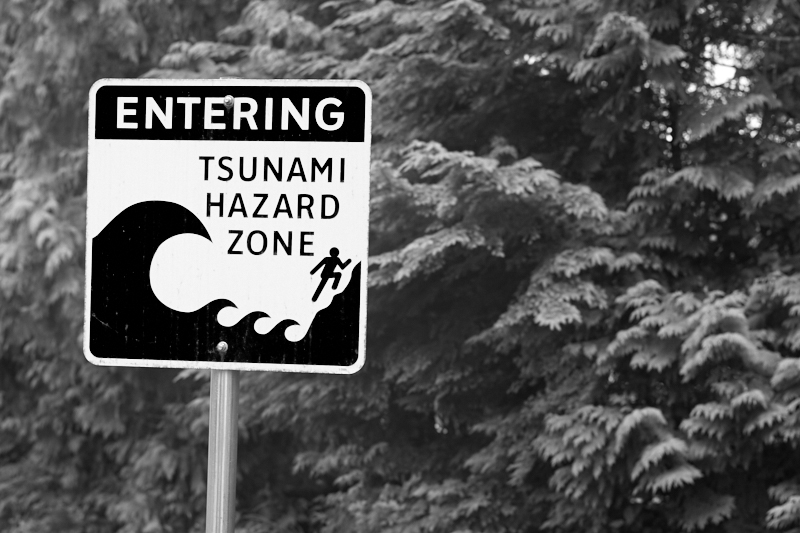 No one seems particularly worried here. Down south, American civil defense planners have been working overtime to prepare for the disaster. One finds tsunami warning signs and evacuation routes signposted wherever the highways slope to the sea; this summer saw a major civil defense exercise that involved FEMA, local authorities, and the National Guard. In Ucluelet? Well, there is a sign off Peninsula Avenue, and the local high school — one of the highest points of land at 90 feet — serves as a marshaling point, but if the quake is as big as predicted, no one will be able to outrun it here.