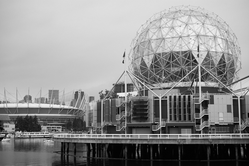The remains of the Olympic Village (Vancouver hosted the 2010 Winter Olympics) sits at the eastern end of False Creek. We pass between it and the geodesic dome that resembles a silver golf ball and belongs to the TELUS World of Science complex.