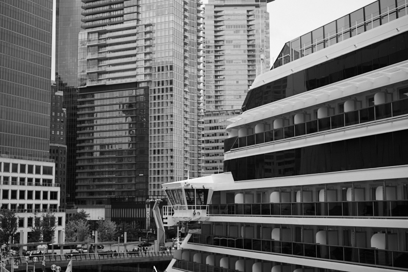 A massive cruise ship blends easily with the skyscrapers in the background, Vancouver, BC