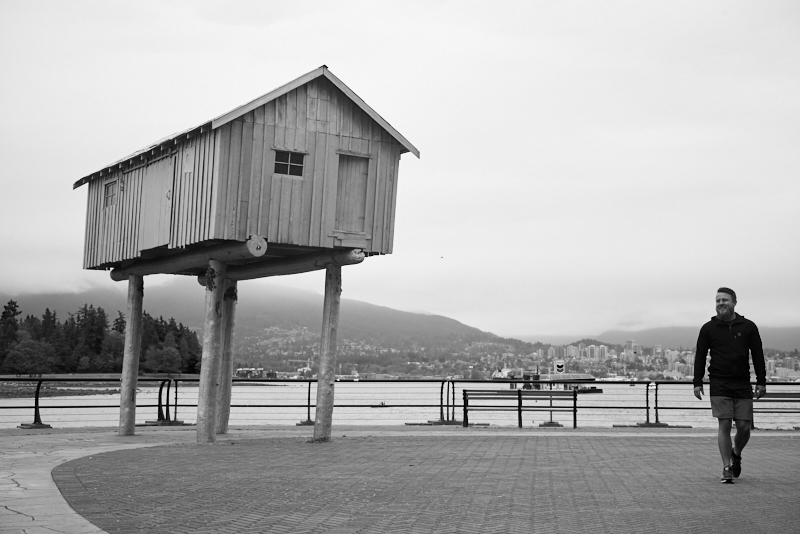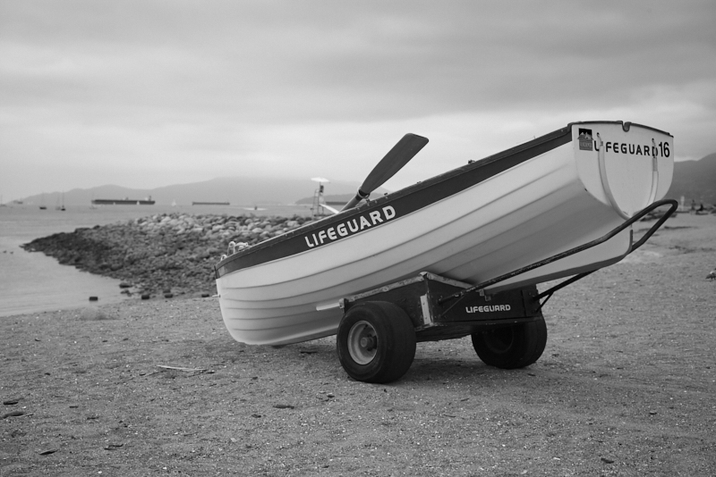 Our last major change of course comes at Siwash Rock, a monolithic piece of stone that marks the northwestern corner of Stanley Park. We walk south by southeast, encountering an ever-growing number of visitors. Stanley Park flows into the beach along English Bay. The sky is still overcast; no one is swimming (or even sun bathing) and the Lifeguard Rescue boat stands unused and unwanted.