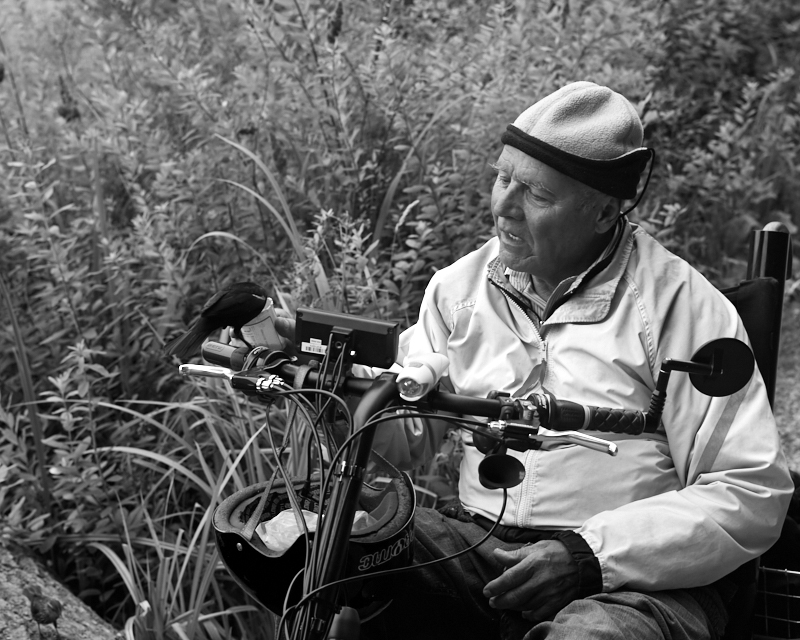 Beaver Lake is, perhaps unsurprisingly, a large beaver pond in the middle of the park. As we stroll along its periphery, we encounter the Bird Man of Stanley Park. He is seated in a recumbent bicycle at the edge of the pond, and is luring a pair of redwing blackbirds to his side. A bold male flies in and roosts for a moment on his bicycle handlebars.