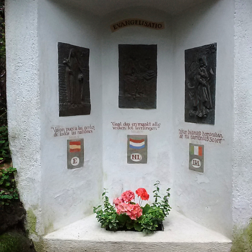 The Via makes a steep ascent to the west as it leaves Bressanone. The road turned to a dirt path that continued up through a pine forest and past several votive chapels. This is Il sentiero dei Santi d'Europa (The Trail of the European Saints). Eight small chapels illustrate themes like "evangelization," "justice and peace," and "the family." Each chapel honors three European saints, and features a biblical verse rendered in three different European languages.