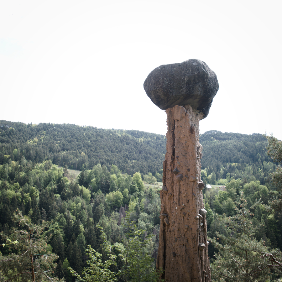 The Pyramids of the Earth were formed when rain eroded a bed of clay. Over the centuries, water carried off loose particles. As precipitation slowly washed the clay away, a pillar formed beneath harder rocks embedded in the clay. Each rock served as an umbrella for the clay beneath it, and consequently, erosion carved a spike beneath each rock. The stones sit like pillar saints, perched atop their clay columns. They are much taller than one would think possible, with some dwarfing the nearby trees. This area, between Collalbo and Bolzano, has some of the best Earth Pyramids in the world.