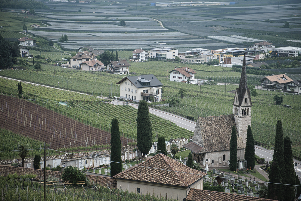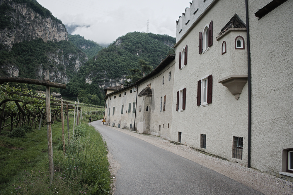 Cortaccia, one of the towns on today’s route, is aesthetically pleasing, while still very much an agricultural town. The buildings are old, large, and ornate stone edifices. Nevertheless, in the under spaces that probably once housed animal stables, we saw tractors and farm equipment. The tractors roaring by in the streets, pulling sprayers and fertilizers, reminded us that this was a farm town, albeit a very beautiful community.